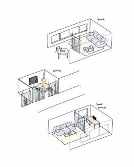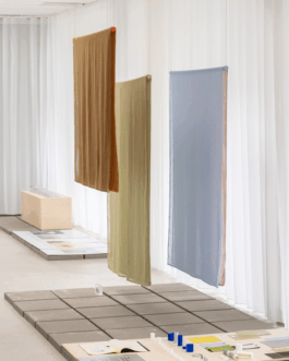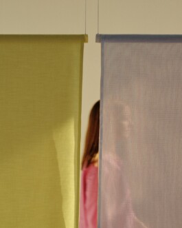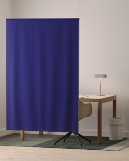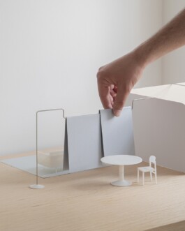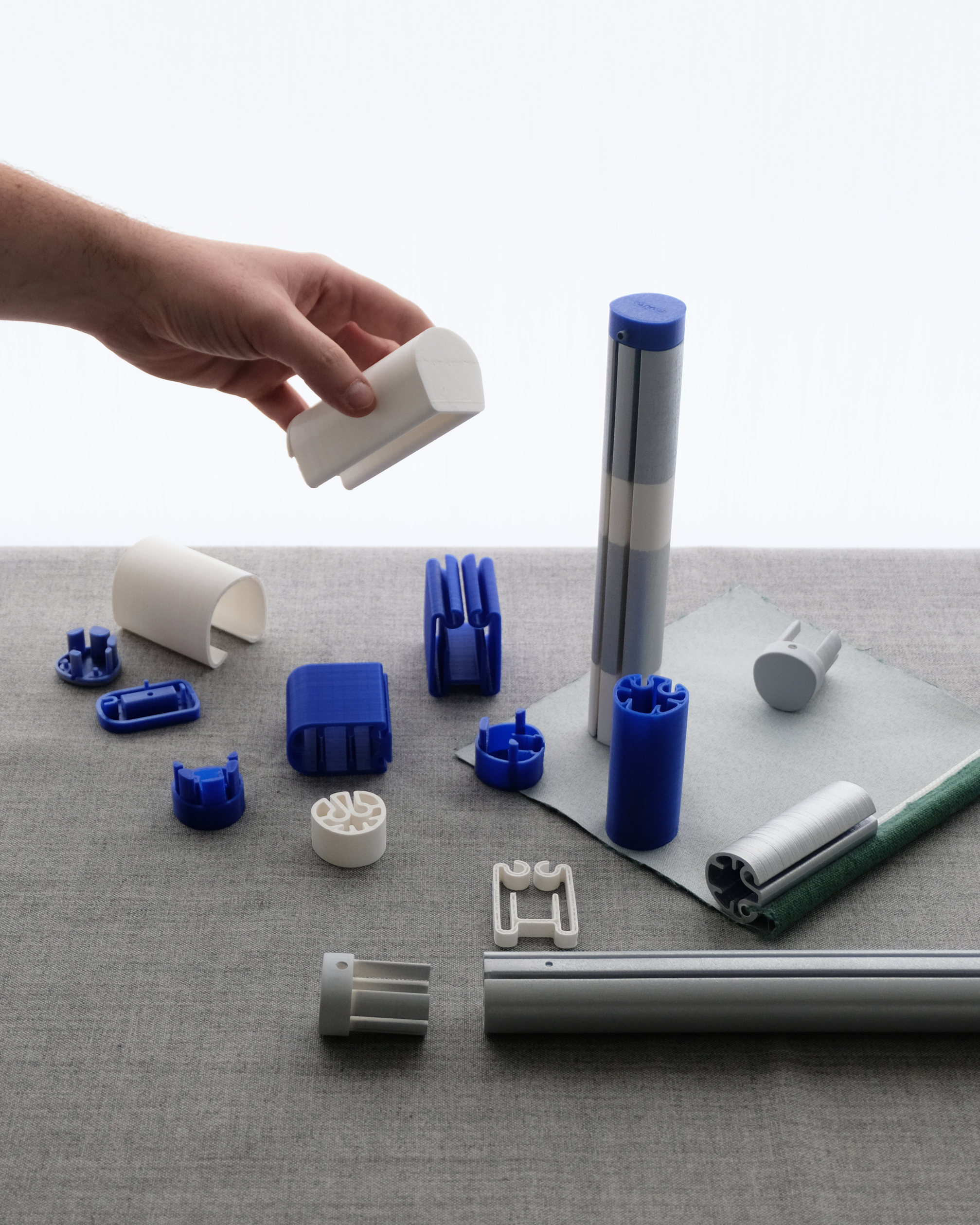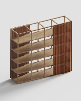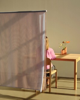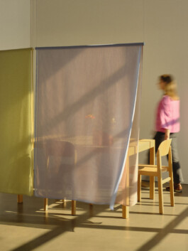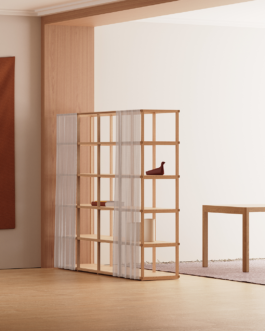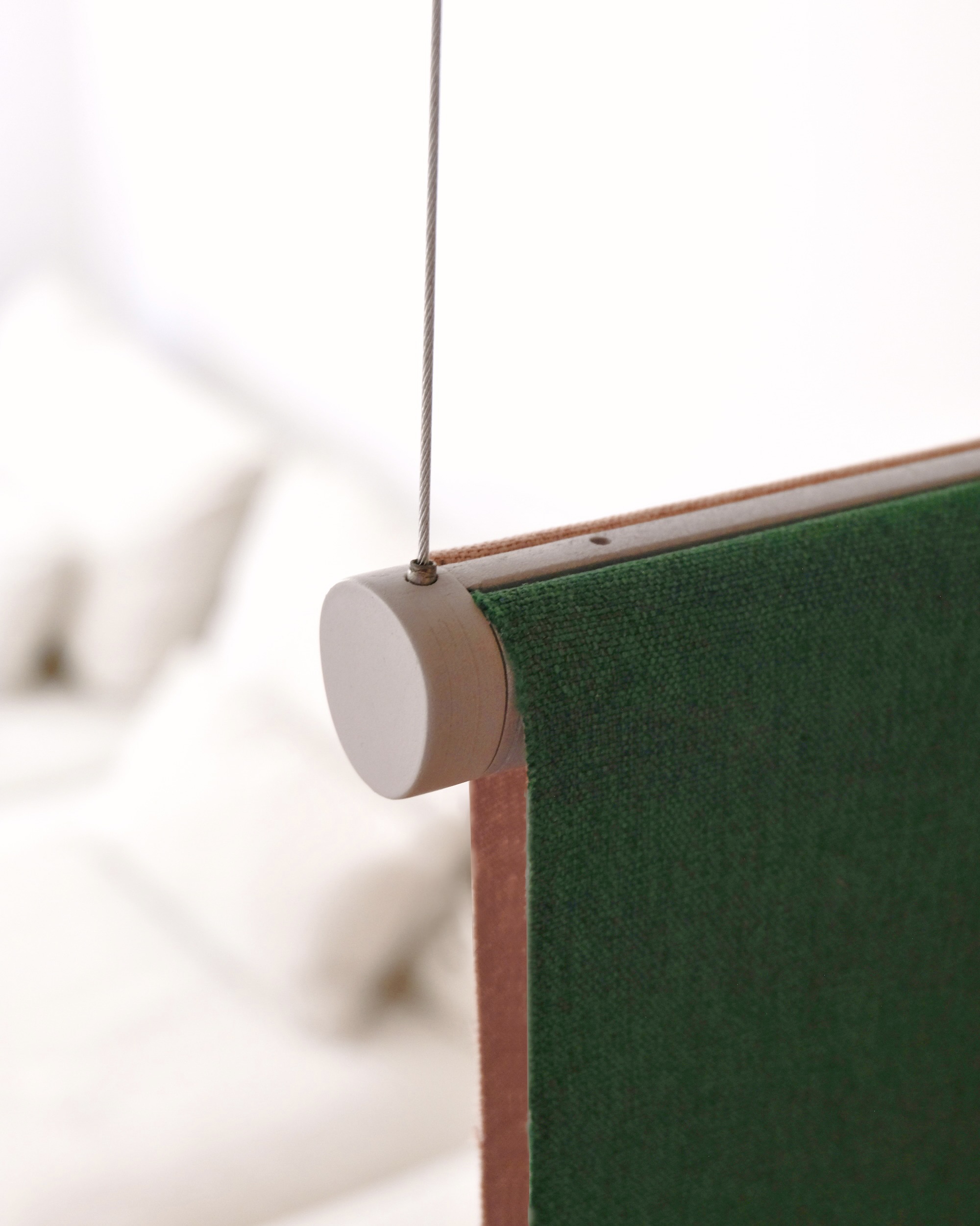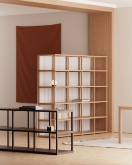 Offset is a shelf which contrasts softness and geometry. A fabric screen hides/reveals objects and creates intimate privacy. It is supported by an expressive wooden frame, whose shared connecting joint allows various sizes, is flat-packable and assembled with one tool.